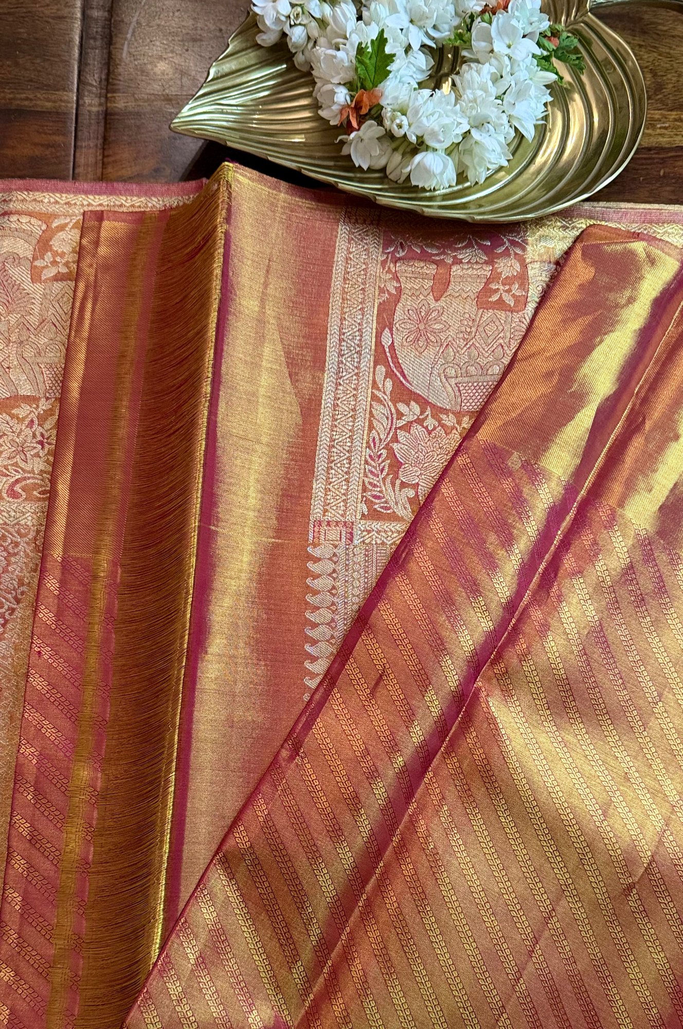 Woven using premium mulberry Tissue silk, this saree offers a rich texture, luminous finish, and graceful drape. The stunning antique gold tone paired with detailed zari artistry makes it an ideal choice for bridal wear, grand weddings, temple occasions, and festive celebrations.
