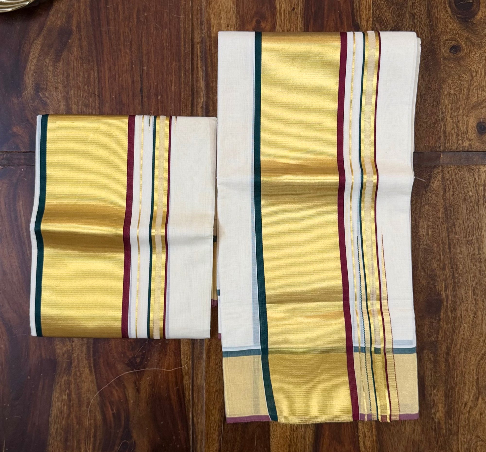 - Border: 2-Inch Kasavu (Zari) Border with Green & Maroon Temple Lines