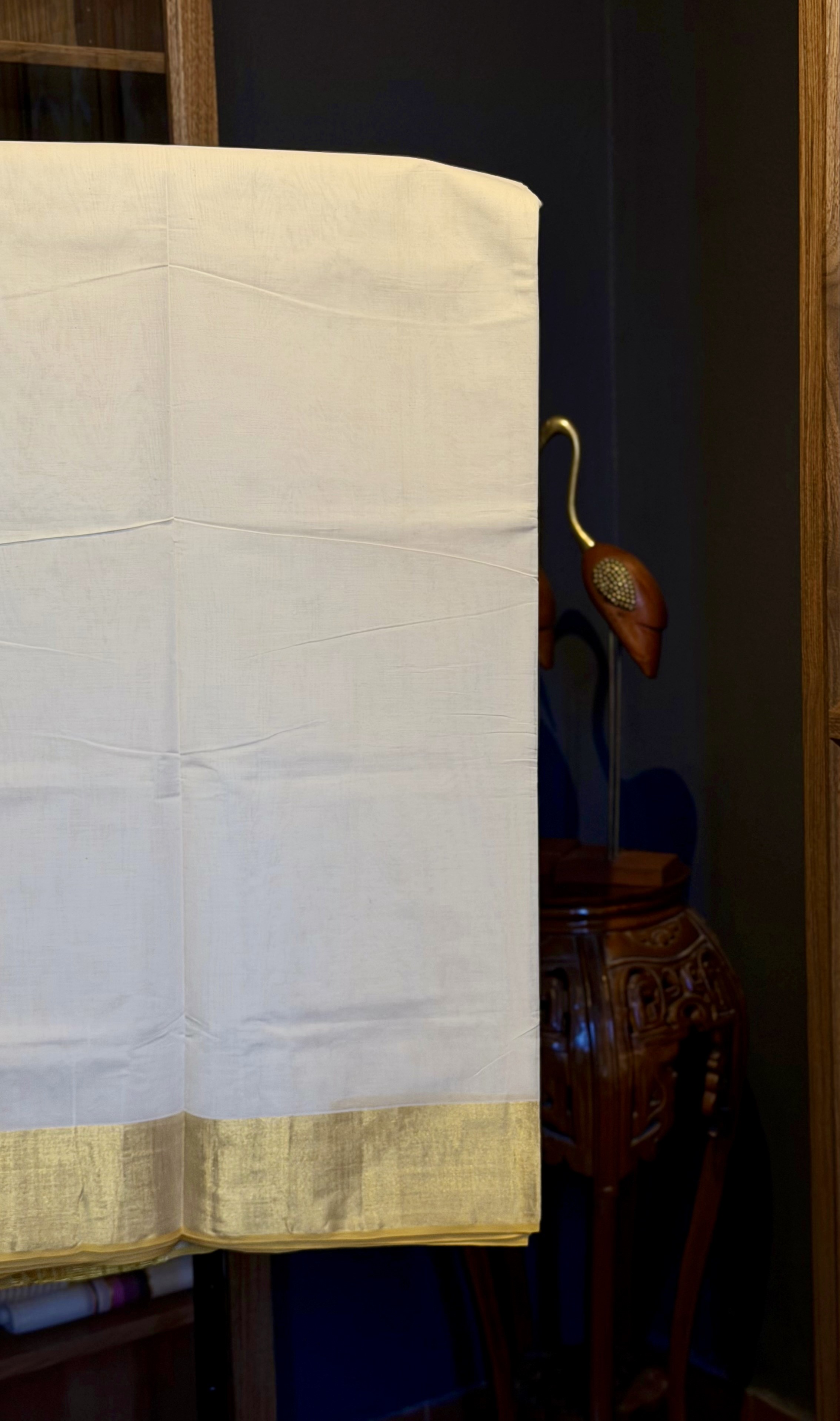 The body of the saree retains the classic elegance of natural off-white handloom cotton, allowing the brilliance of the Kasavu tissue pallu to stand out while maintaining the understated beauty associated with traditional Kerala Kasavu sarees.