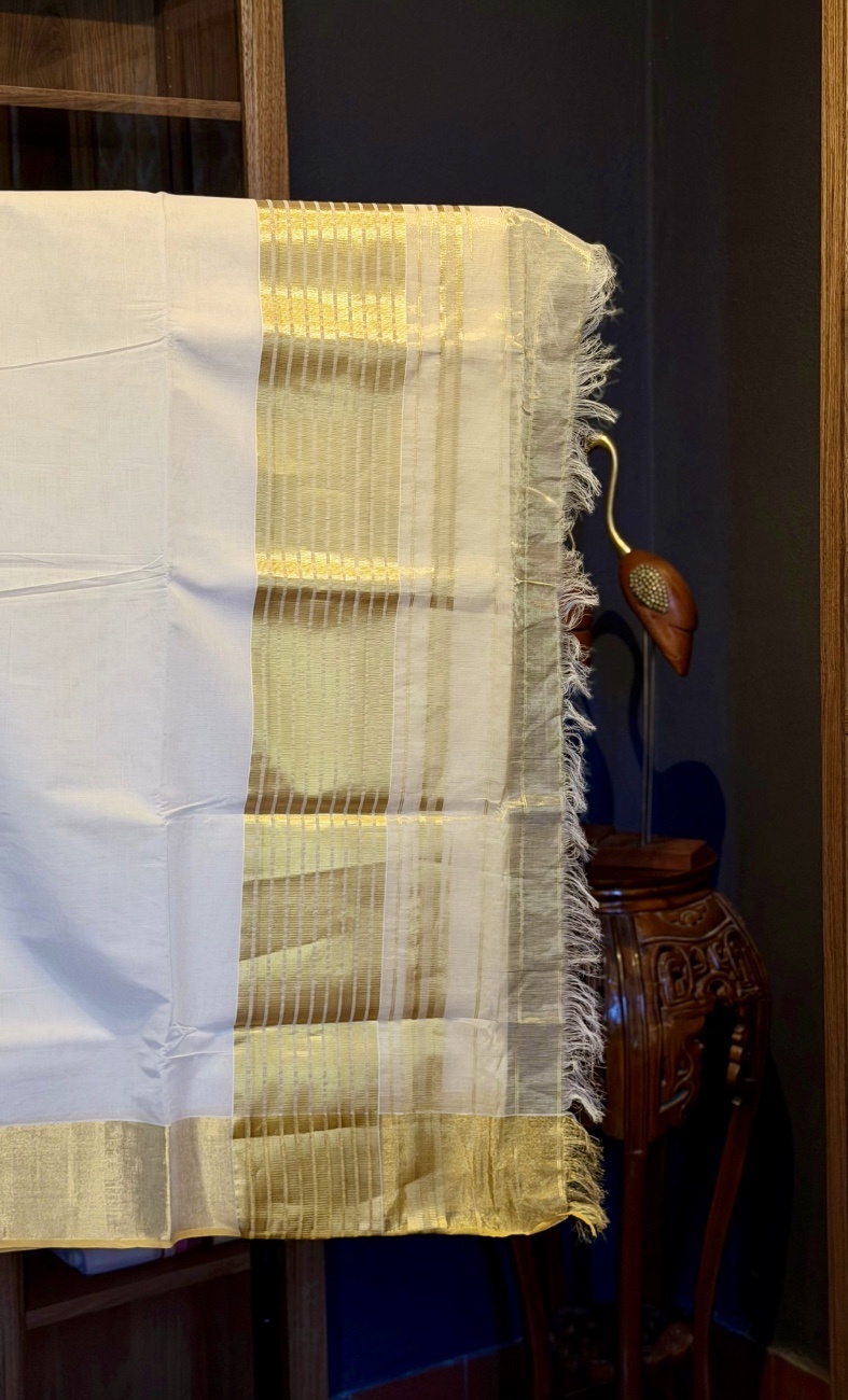 Woven from premium handloom cotton with tissue weaving, the fabric is soft, breathable, and lightweight while carrying a subtle sheen that elevates the elegance of the drape. This saree is ideal for festivals, temple occasions, weddings, and cultural celebrations, where traditional Kerala attire is cherished.