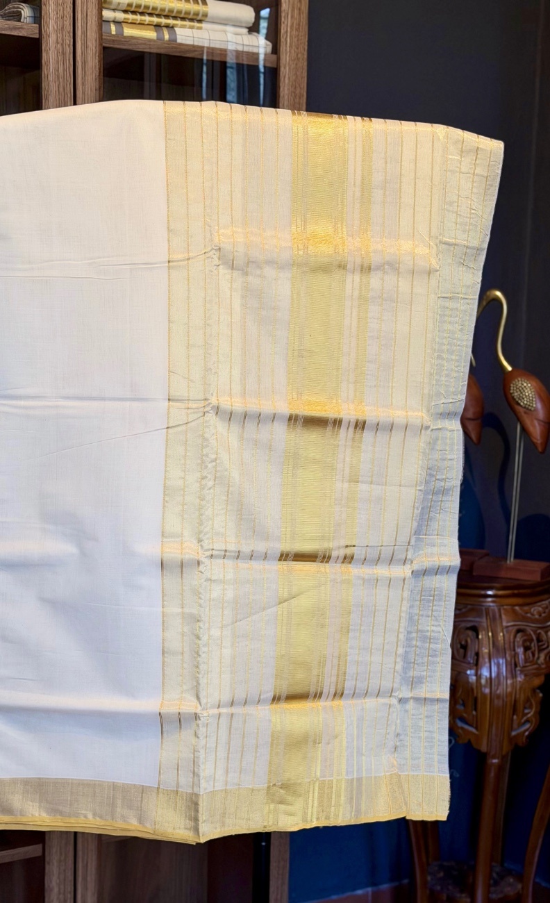 Woven using premium handloom cotton blended with tissue weaving techniques, the fabric is lightweight, breathable, and comfortable while offering a gentle sheen that elevates the saree’s elegance. This saree is perfectly suited for festivals, temple occasions, weddings, and cultural celebrations, where classic Kerala attire is cherished.