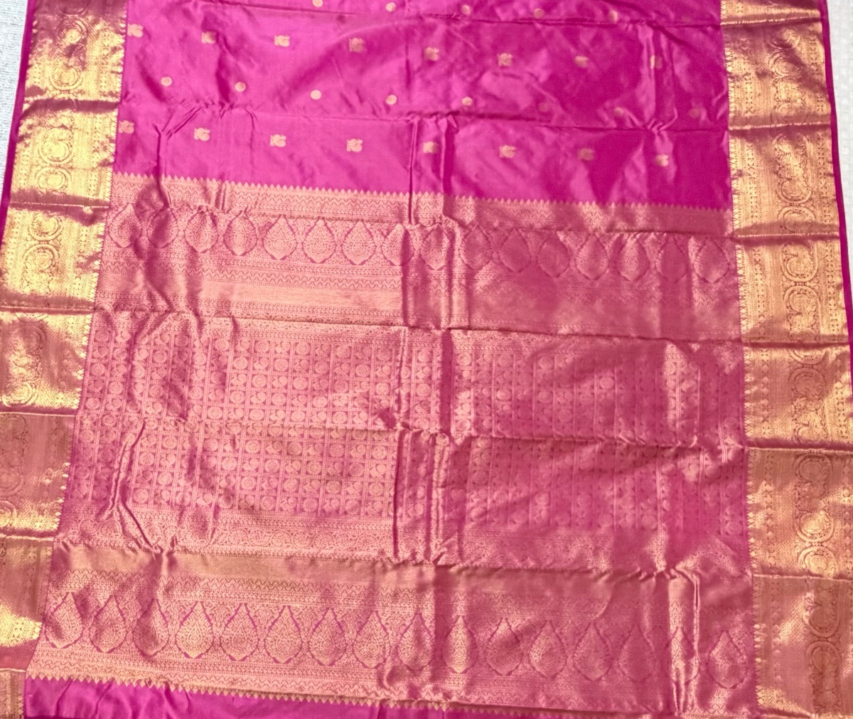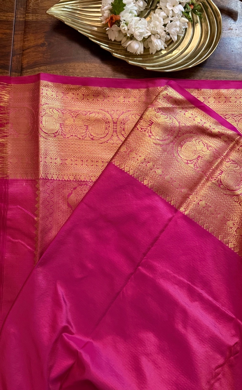 Woven from premium mulberry silk, this saree offers a luxurious drape, radiant sheen, and enduring quality. Its striking pink tone combined with traditional gold zari makes it an ideal choice for weddings, festive occasions, temple celebrations, and cultural gatherings.